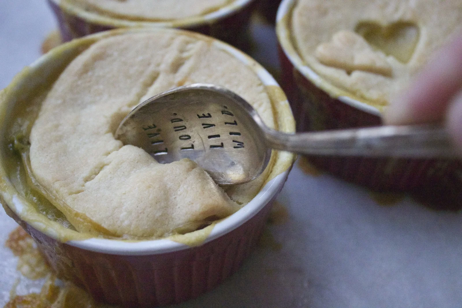 Roll out your pie dough and cut out dough circles that fit on top of your pies. Punch out a cute shape to make a vent for your pie.